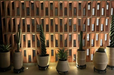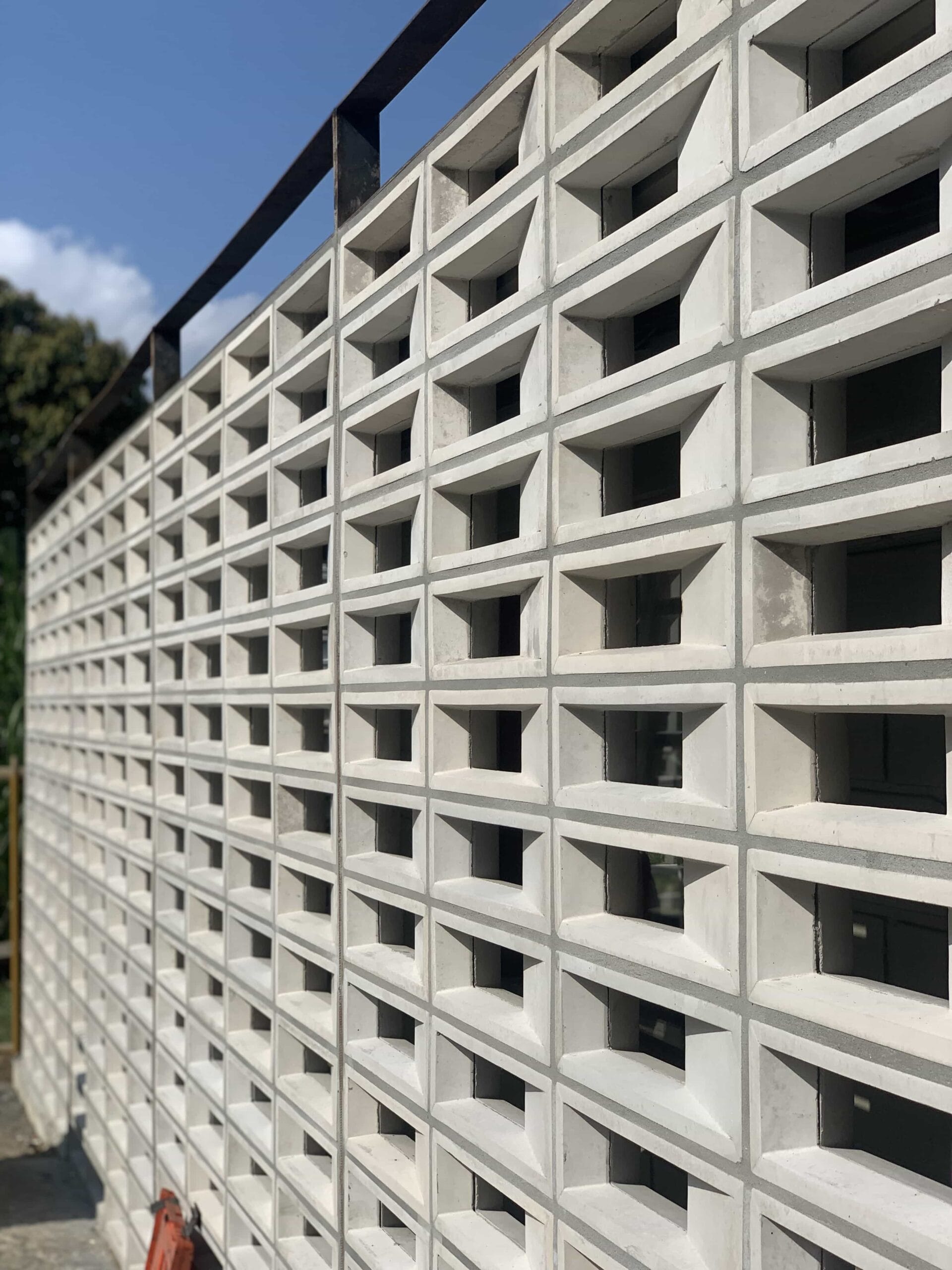 Calado/celosía con inclinación en todas sus caras, ideal para el paso del viento y el manejo de la iluminación, permite cerramientos de grandes espacios y combina armoniosamente con muros de mampostería.
